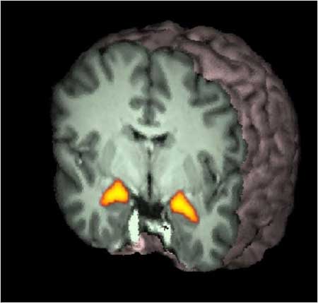 Finally, the highlights of the day. This is the brain activity of one of our subjects recorded while the subject was watching the Disney ad. Both mirror neuron areas and ventral striatum - indicated by the yellow arrows - are engaged by the ad.